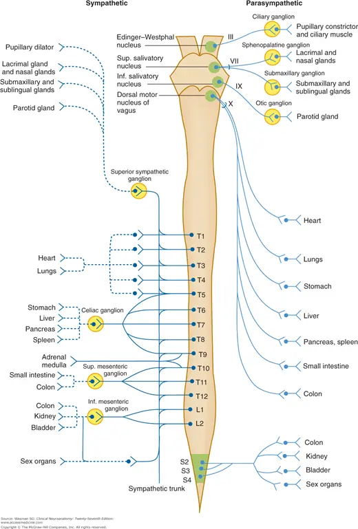 To understand Active Recovery, one must look at the dual-architecture of the Autonomic Nervous System. While the Sympathetic system (the “Gas Pedal”) acts as a unified chain for rapid energy mobilization, the Parasympathetic system (the “Handbrake”) is Craniosacral—meaning it is anchored at the two poles of your neurological axis.